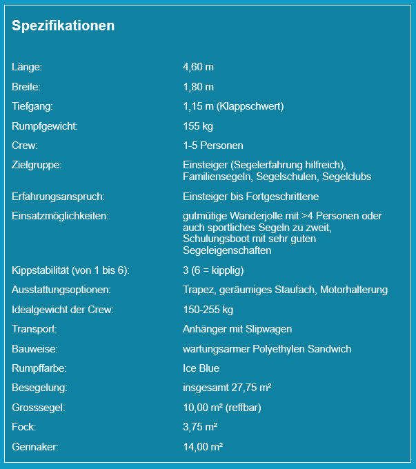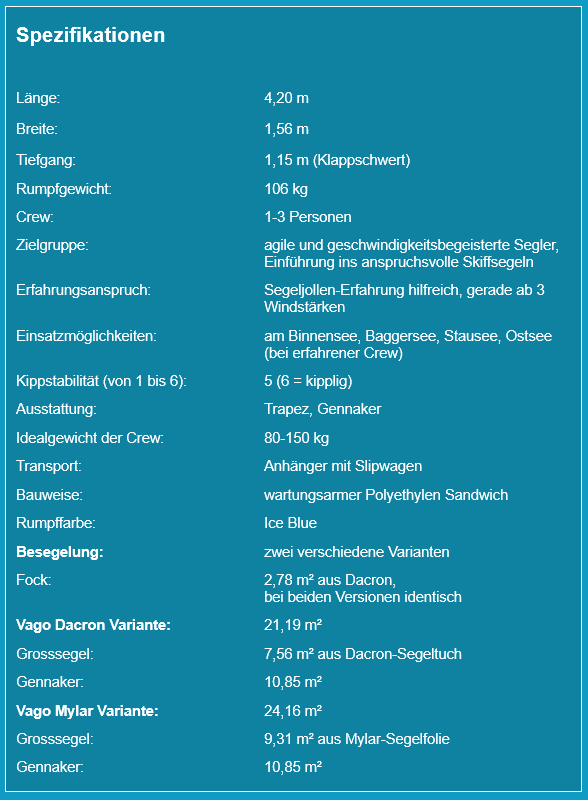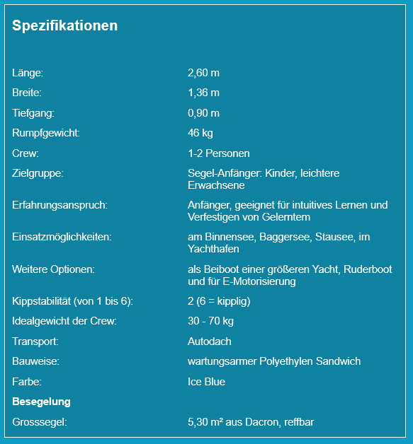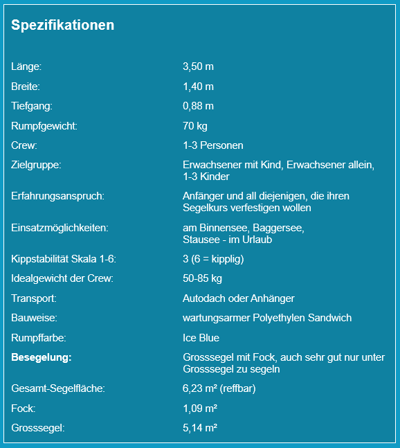 Es ist für seine Leistung gegen den Wind und die einfache Handhabung mit dem Wind bekannt, ausserdem bietet es eine unglaublich stabile Plattform um Segeln zu lernen.