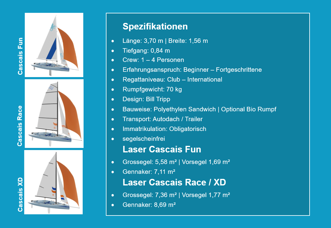Der Laser Cascais mit innovativem Design gebaut von Bill Tripp zieht jeden auf den ersten Blick an. Er vereint leichtes Handling, Geschwindigkeit und Stabilität für ein unvergessliches Segelerlebnis aller Niveaus. Die 3,7 Meter umfasst ein Anwendungsspektrum für die ganze Familie.