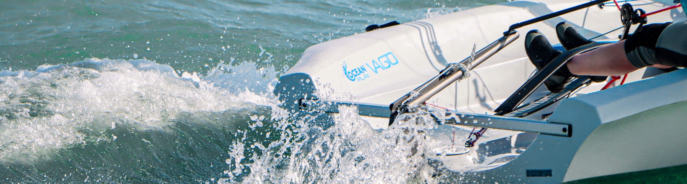 Das Vago hat 3 Segel, ein Grosssegel, eine Fock und einen symmetrischen Kite für den Vorwind. Das Boot und die Steuerleinen sind sehr einfach angelegt, sodass auch fortgeschrittene Segler leicht in das Boot einsteigen und sich wohlfühlen können.