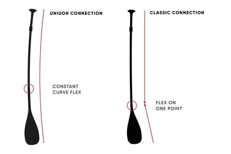 In der Vergangenheit haben sich die Flex-Kurven von Paddeln aus zwei Bereichen zusammengesetzt: Blade und Schaft, die durch ein übergrosses, steifes Verbindungsstück miteinander verbunden wurden. Das Fanatic Union Paddel hat das Flex-Verhalten teilbarer Paddel revolutioniert. Der Flex verläuft jetzt harmonisch von der Blade-Spitze bis zum Schaft. Das Verbindungsstück sitzt nun weiter oben am Schaft, was zu einem konstanteren Flex sowie einzigartiger Federkraft und Reaktionsfreudigkeit mit jedem Paddelzug führt. Von der Sekunde an, in der das Paddel das Wasser berührt, wird jede Energie sofort in eine Vorwärtsbewegung umgewandelt.