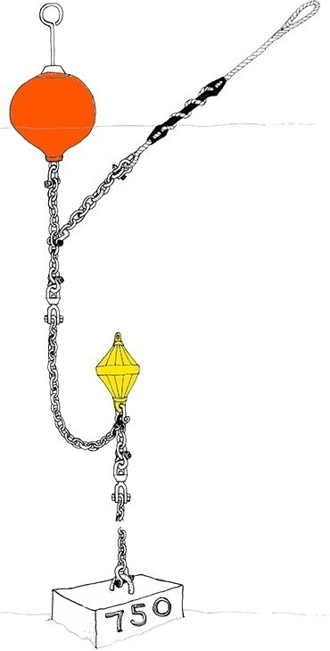 Im Zürichsee werden normalerweise Ketten aus blankem Stahl als Grundgeschirr verwendet. Wir verwenden diese in einer speziell gehärteten und auf Zug geprüften Ausführung. Dies bedeutet nicht, dass stetige Reibung der Kettenglieder keine starke Abnutzung derselben verursacht. Insbesondere Sand und Schlick fördern den Materialschwund zusätzlich. Die meisten Konzessionen verlangen, dass die Grundkette senkrecht vom Bojenstein zur Oberfläche geführt wird. Dies wird mit einer oder mehreren Zwischenbojen (Unterwasserbojen) sichergestellt. Wir verwenden hier ausschliesslich unsinkbare, geschlossenporig-ausgeschäumte Bojen, welche wir exklusiv für unsere Kunden herstellen lassen. Schäkel müssen mit geeigneten Mitteln (z. Bsp. hochfestem Draht) gesichert werden.